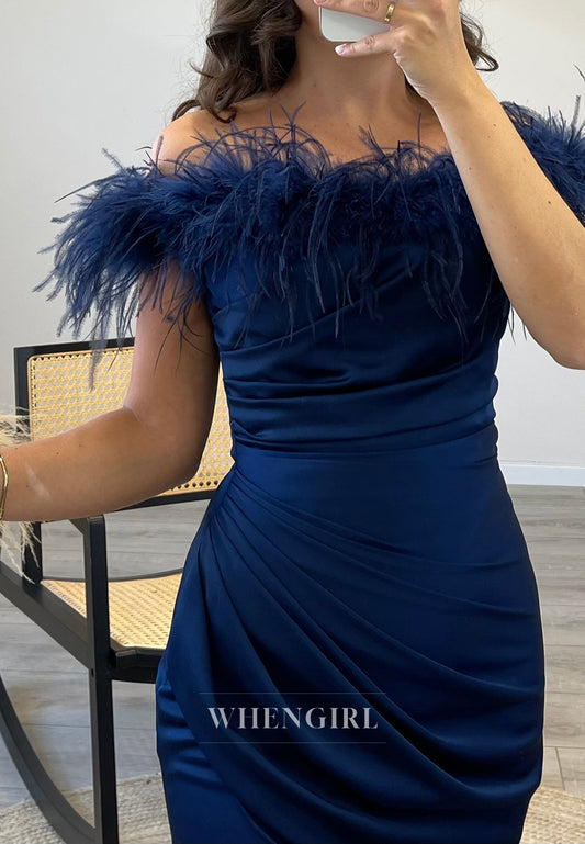 Unique Feather Off Shoulder Side Slit Pleated Formal Evening Dress with Sweep Train
