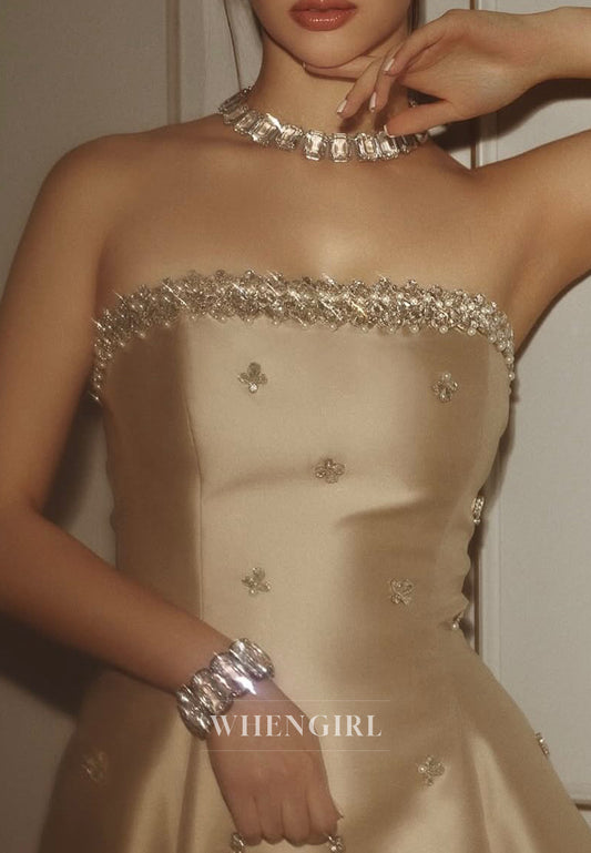 Champagne Tube Top Rhinestones Beading A-Line Satin Evening Formal Dress
