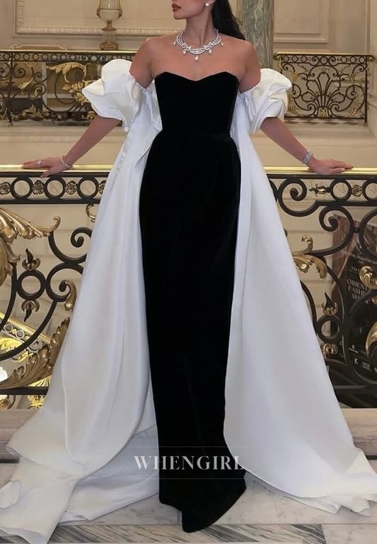 Black Velvet Sweetheart Strapless Sheath Evening Dress with White Cape