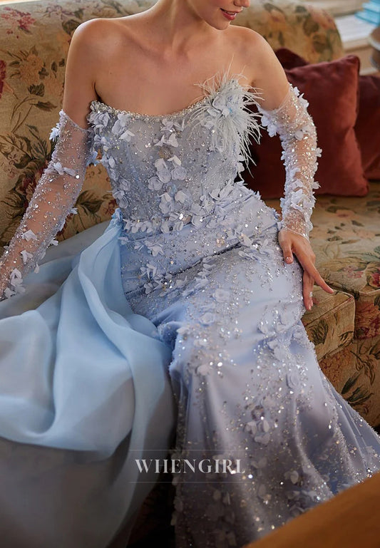 One Shoulder Long Sleeve Side Slit Bead Pleated Asymmertrical Mermaid Evening Formal Dress