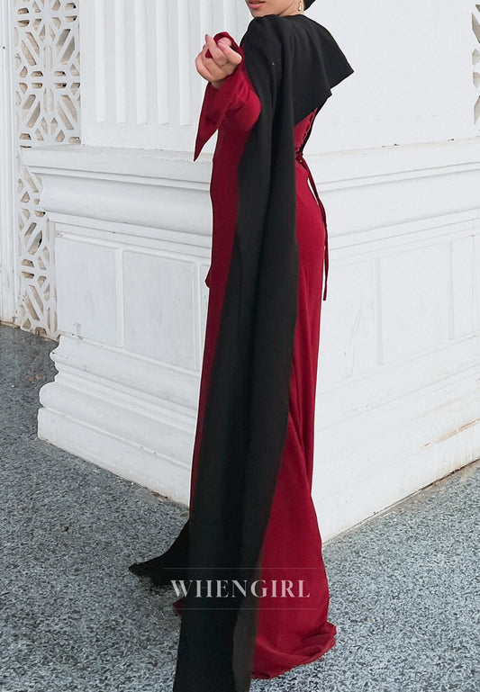 Burgundy Column Bateau Neck Long Sleeves Simple Evening Dress with Black Cape