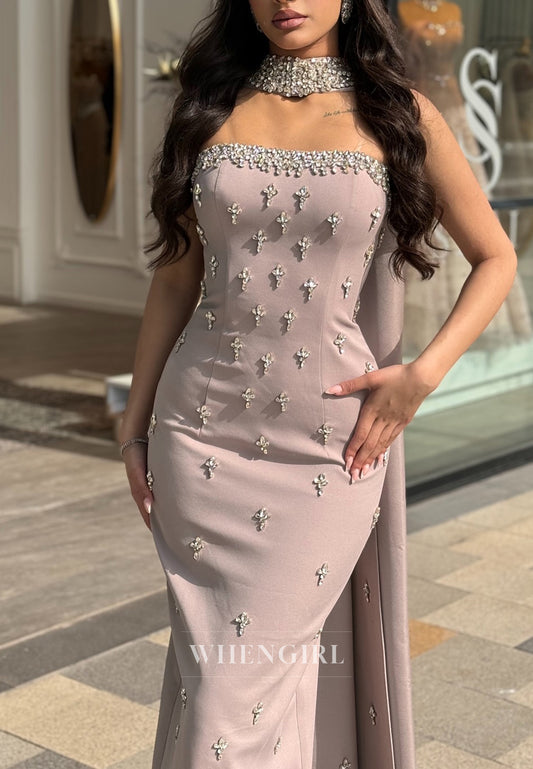Mauve Strapless Beaded Ankle Length Sheath Evening Formal Gown with Cape