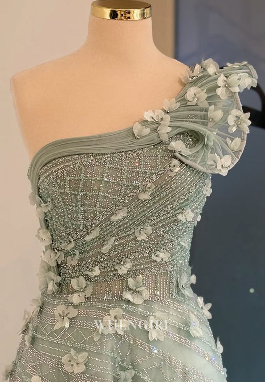 Agave Green One Shoulder Sleeveless Floral Tulle Formal Gown Pleated A-Line Evening Dress