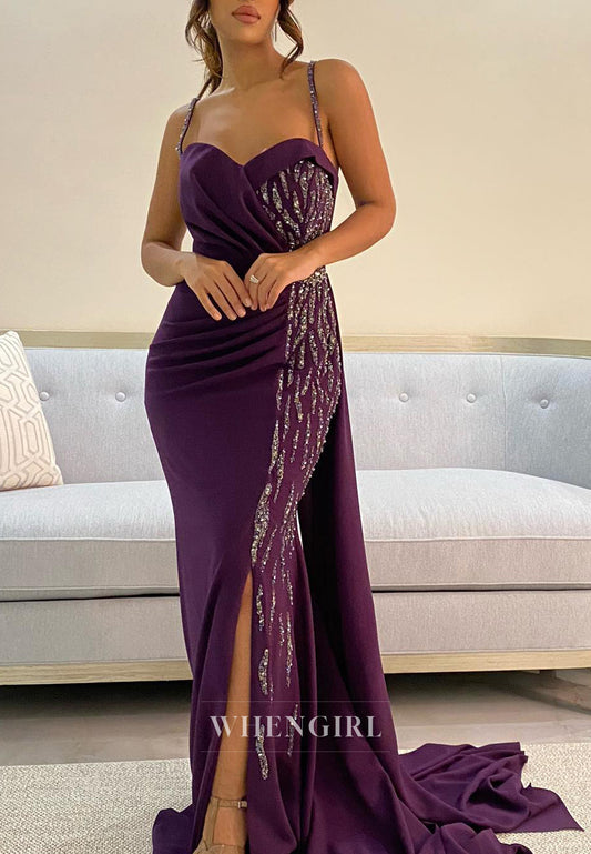 Grape Spaghetti Straps Sweetheart Pleated Sweep Train Side Slit Chiffon Mermaid Formal Evening Dress