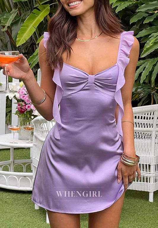 Pink Sweetheart Ruffles Straps Side Slit Lace Up Sheath Short Homecoming Dress