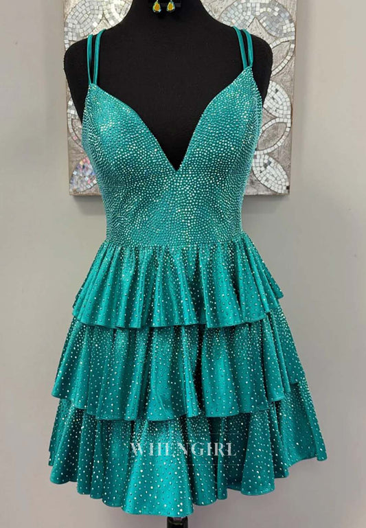 Lace Up Crystal V Neck Sleeveless A-Line Multi-Tiered Ruffle Short Homecoming Dress