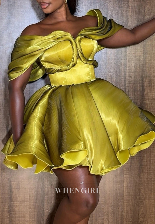Stunning A Line Off the Shoulder Yellow Satin Short Homecoming Dress