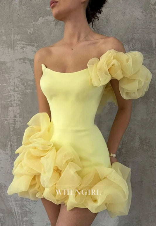 Light Yellow Bateau Neck Sleeveless One-Shoulder Short Sheath Homecoming Dress