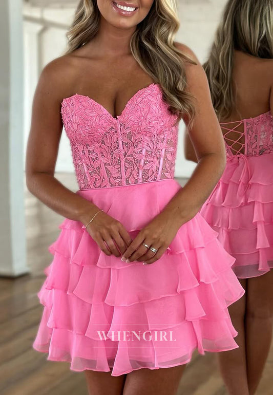 A-Line Sleeveless Appliqued Lace Sweetheart Lace Up Chiffon Tiered Homecoming Dress