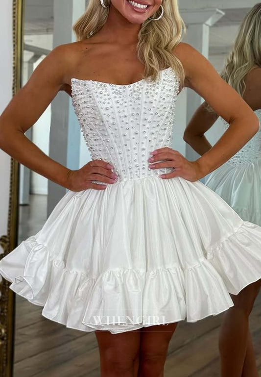 A-Line Ruffle Pearls Sleeveless 8th Grade Dance Beaded Strapless Homecoming Dress