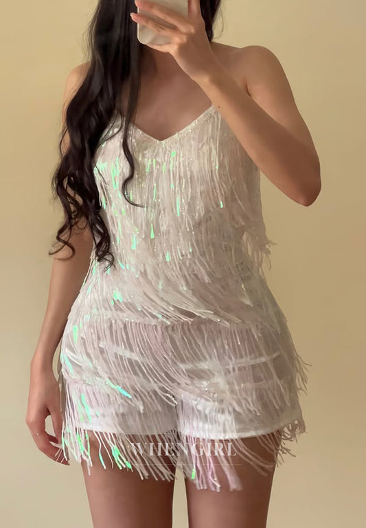 Beaded V Neck Sleeveless Sequins Tassel Sheath Short Homecoming Dress