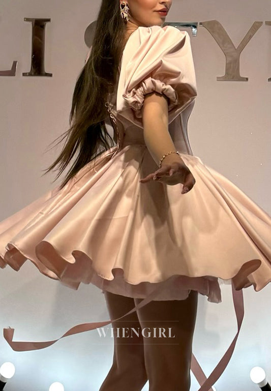 Blush Square Neck Short Puff Sleeves A-Line Homecoming Dress