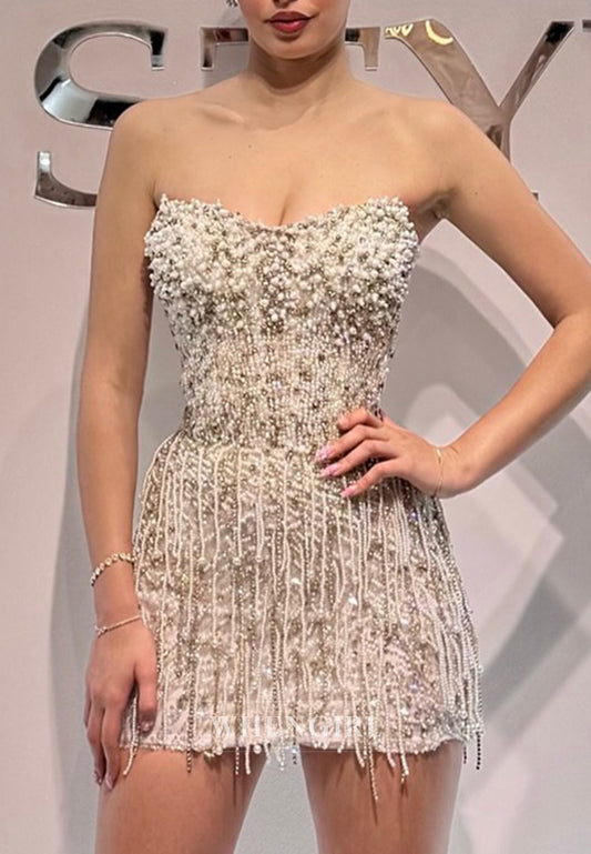 Sheath Sivler Pearls Beaded Sleeveless Tube Top Short Homecoming Dress