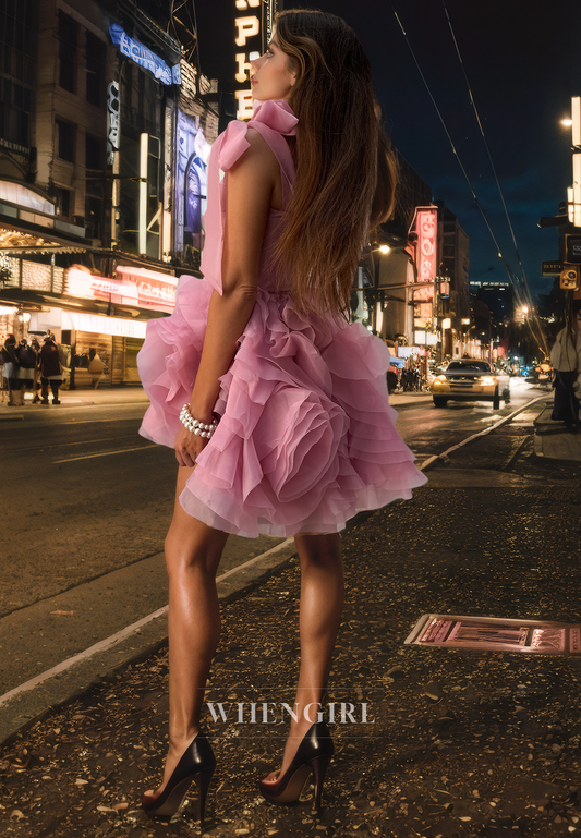 A-Line V Neck Halter Sleeveless Tulle Tiered Bow Knot Homecoming Dress