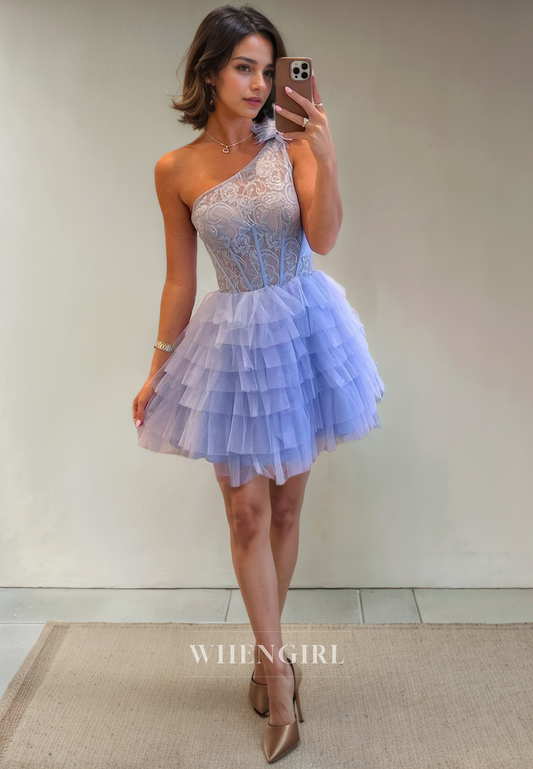 A-Line One Shoulder Sleeveless Appliques Tulle Tiered Back Zipper Homecoming Dress