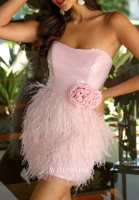 Blush Strapless Tube Top Feather 3D Flowers Sheath Short Homecoming Dress