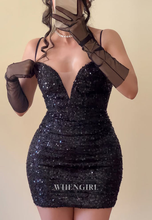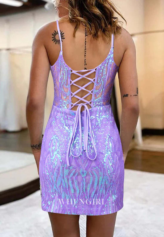 Sheath V Neck Spaghetti Straps Sleeveless Squins Cross Back Homecoming Dress