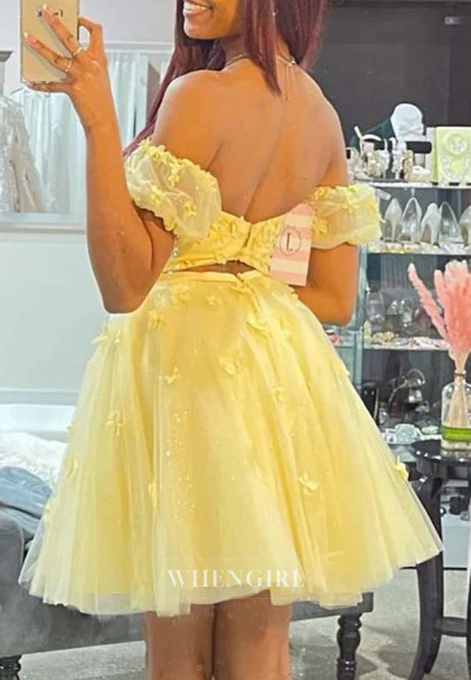 Daffodil Sweetheart Off Shoulder Flowers A-Line Tulle Short Homecoming Dress