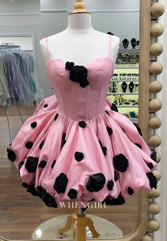 Blush Pink Sleeveless Spaghetti Straps Sweetheart A-Line Short Homecoming Dress with Black Folwers and Gloves