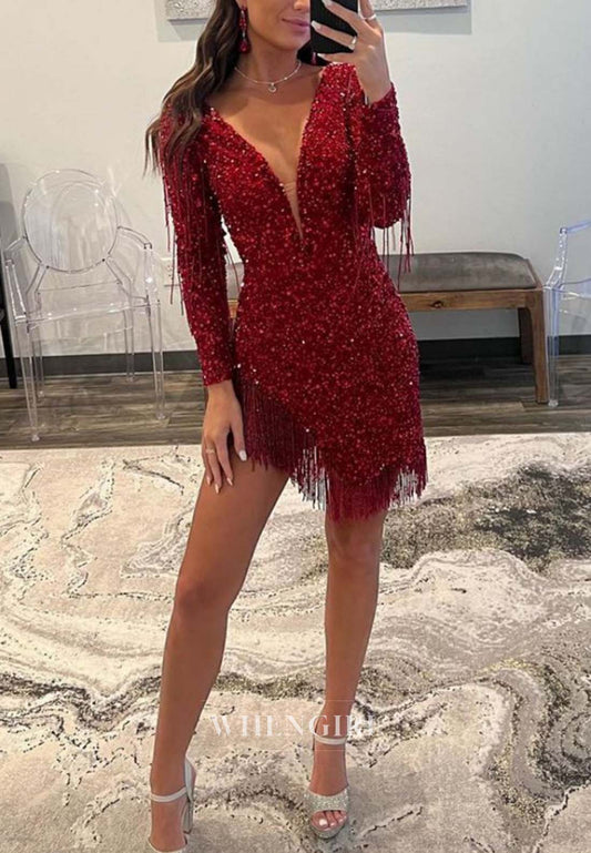 Burgundy V Neck Beads Long Sleeves Tassel Asymmtrical Hem Short Homecoming Dress