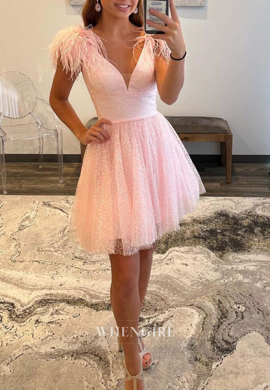 Blush V Neck Feather Sleeveless A-Line Short Beads Homecoming Dress