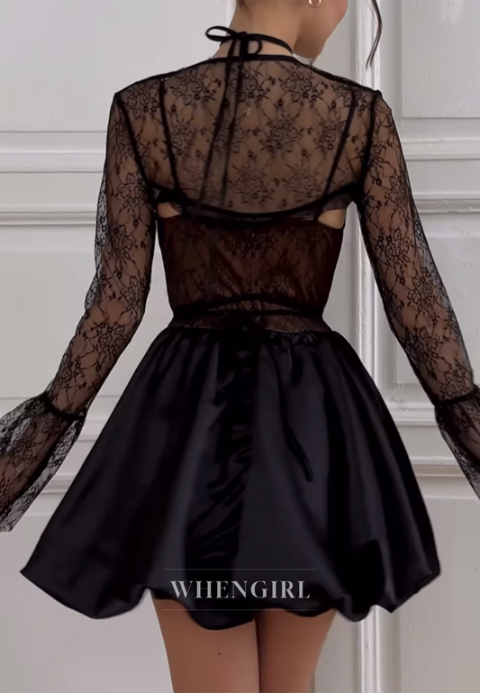 Black Cross Neck A-Line Embroidery Lace Long Sleeves Homecoming Dress