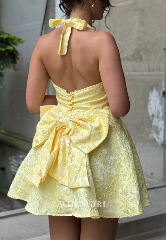 Halter V Neck Sleeveless A-Line Homecoming Dress Bowkot Lace Up Party Dress