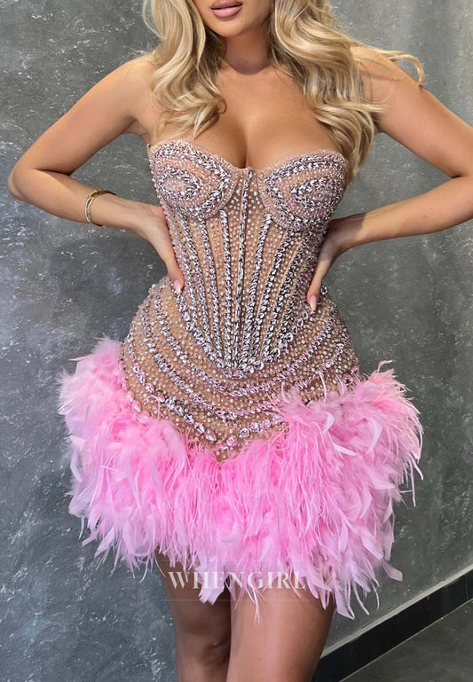 Glitter Sweetheart Crystal Beaded Feather Sleeveless Sheath Short Homecoming Dress