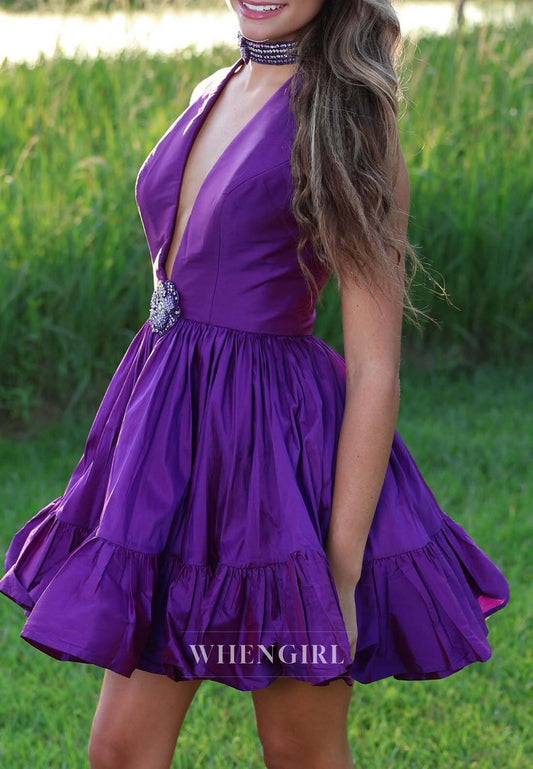 Regency Halter V Neck Sleeveless Beaded A-Line Shport Homecoming Dress