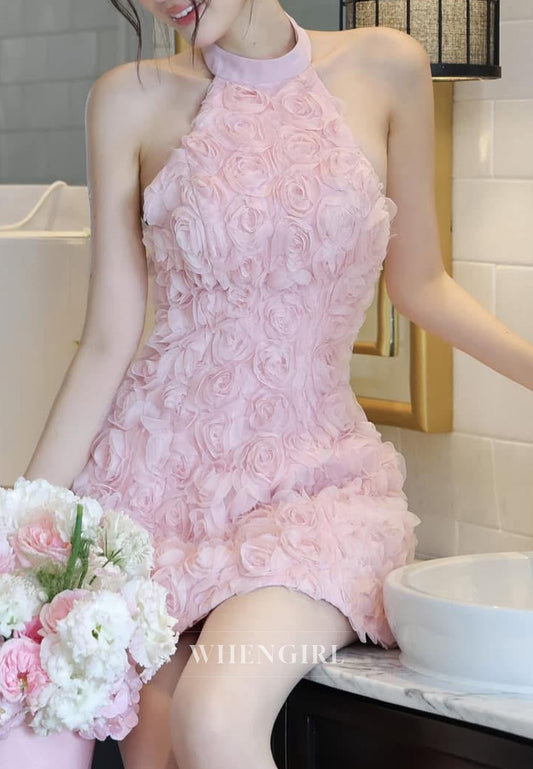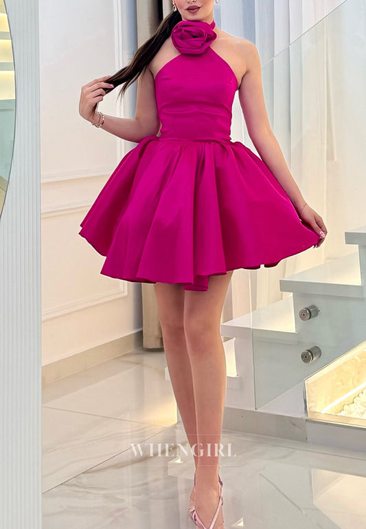 Fuchsia Sleeveless Halter 3D Flowers A-Line Short Homecoming Dress