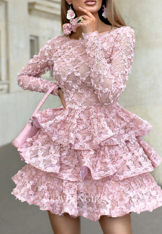Pale Blush A-Line Long Sleeves Tiered Ruffles Floral Bateau Homecoming Dress