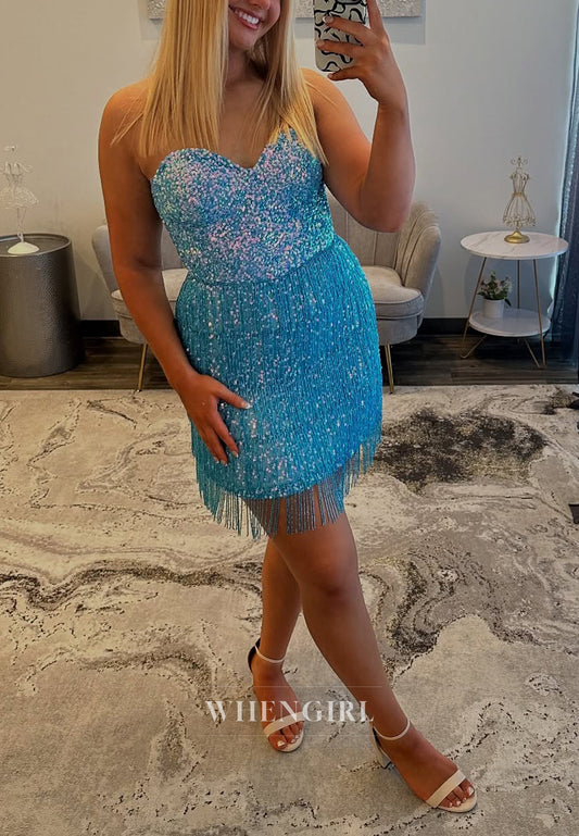 Ocean Blue Sweetheart Sequins Tassel Sheath Sleeveless Homecoming Dress