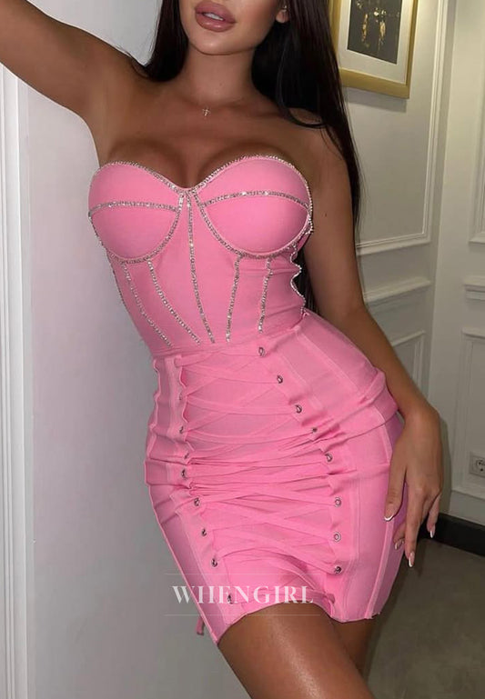 Candy Pink Sleeveless Sweetheart Beaded Sheath Strapless Short Homecoming Dress