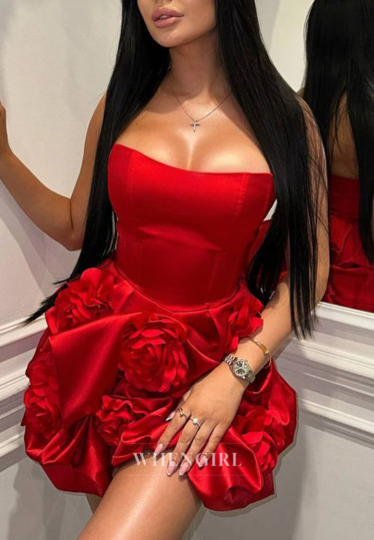 Red Tube Top Sleeveless 3D Flowers Sheath Pleated Satin Short Homecoming Dress