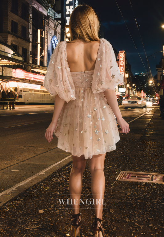 A-Line Sreapless Short Sleeves Tulle Tiered Back Zipper Homecoming Dress