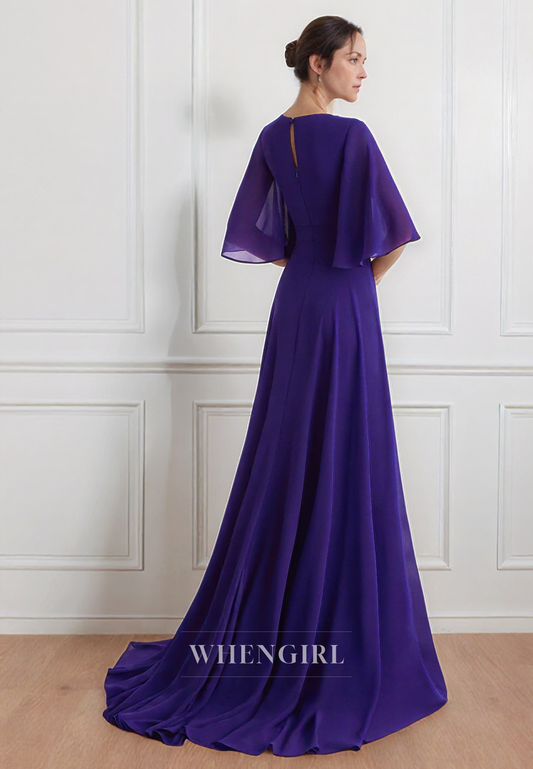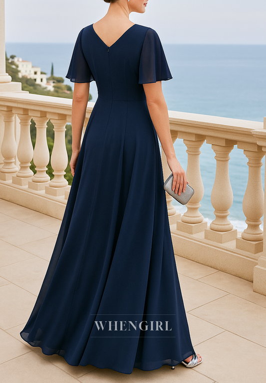 Column V Neck Short Sleeves Side Slit Elegant Long Mother of the Bride Dress