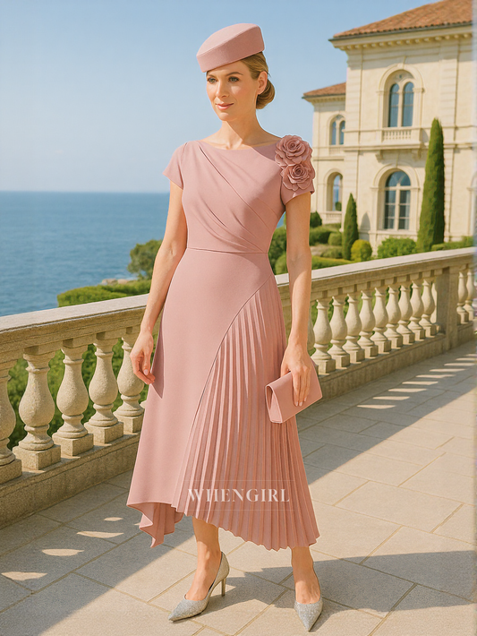 Dusty Pink Short Sleeves Column Tea Length Bateau Neck Mother of the Bride Dress
