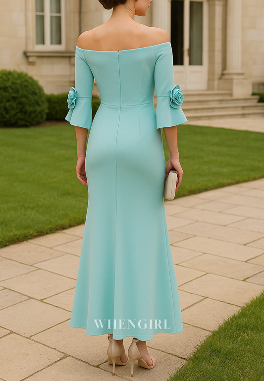 Spa 3/4 Sleeves 3D Flowers Pleated Off Shoulder Ankle Length Mermaid Mother of the Bride Dress