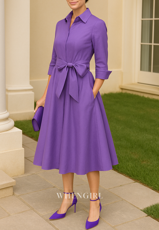 Tahiti A-Line Tea Length 3/4 Sleeves Bowknot Mother of the Bride Dress