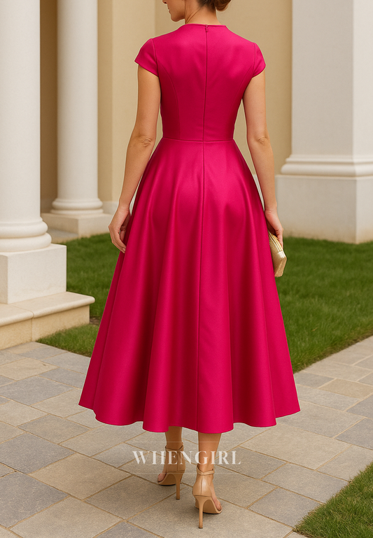 A-Line Tea Length Cap Sleeves V Neck 3D Flower Satin Mother of the Bride Dress