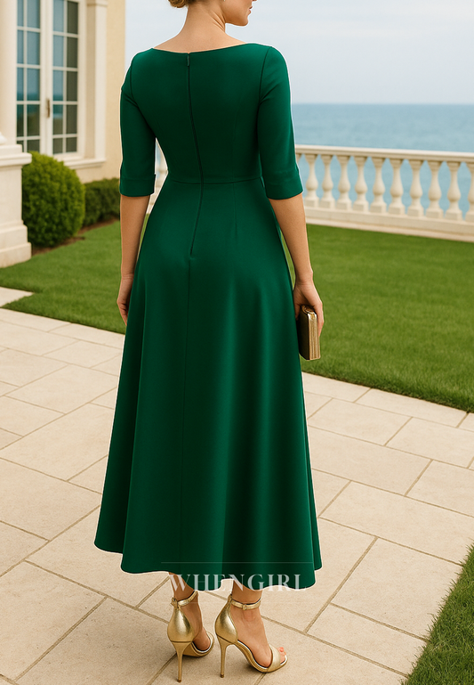 Green Bateau Neck Long Sleeves Tea Length A-Line Mother of the Bride Dress