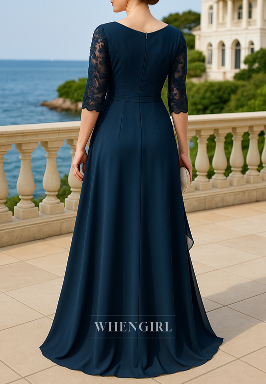 Navy V Neck Lace Half Sleeves A-Line Floor Length Chiffon Mother of the Bride Dress