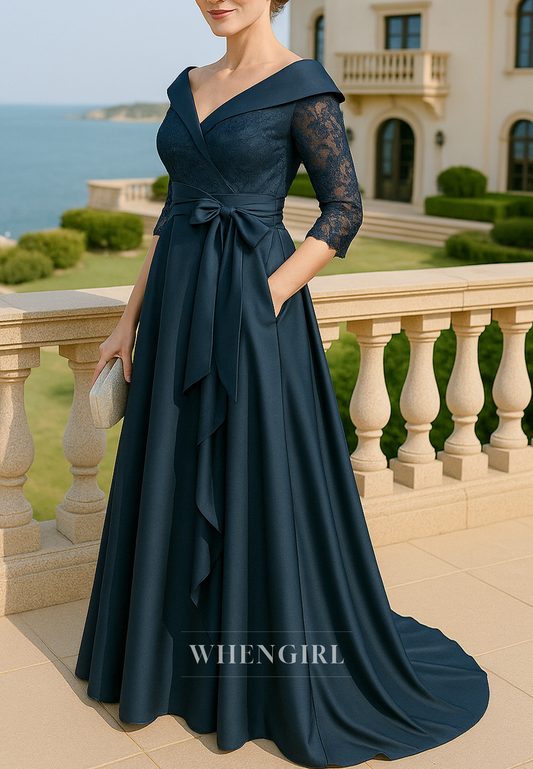 Bowknot Lace Half Sleeves Peacock A-Line Sweep Train V Neck Mother of the Bride Dress