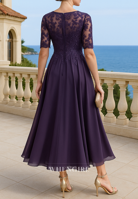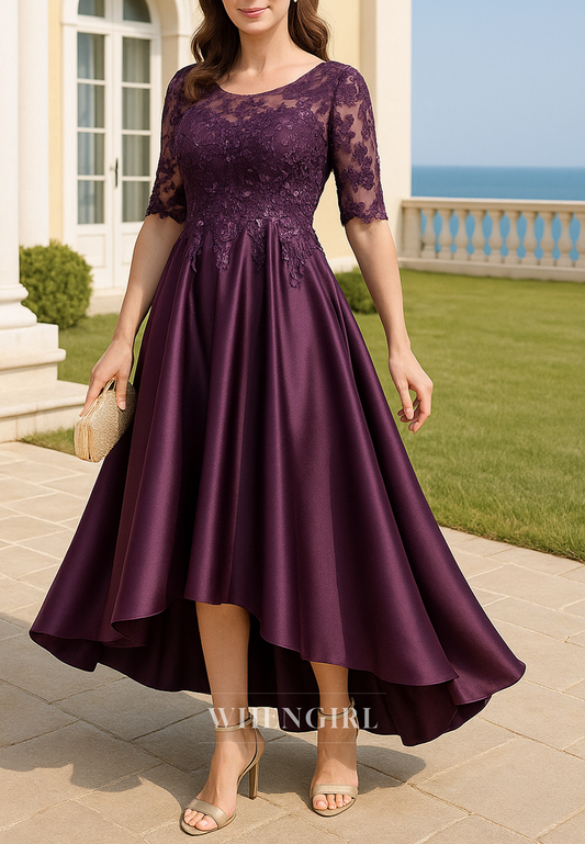 Grape Scoop Neck Short Sleeves Appliqued Lace A-Line Satin Mother of the Bride Dress