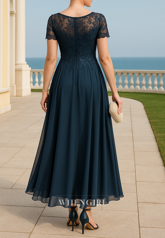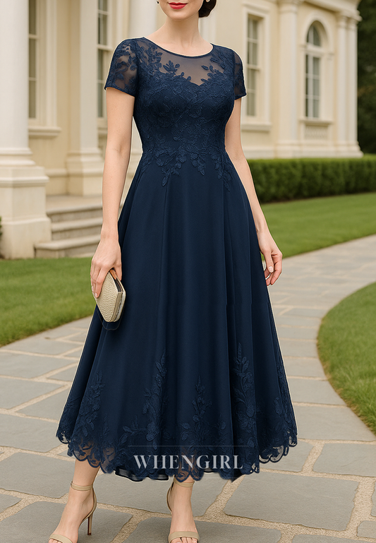 Navy Ankle Length Appliqued Lace Scoop Neck Short Sleeves A-Line Mother of the Bride Dress