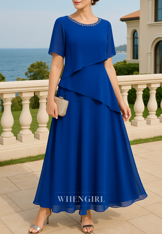 Royal Blue Scoop Neck Short Sleeves A-Line Chiffon Beaded Mother of the Bride Dress