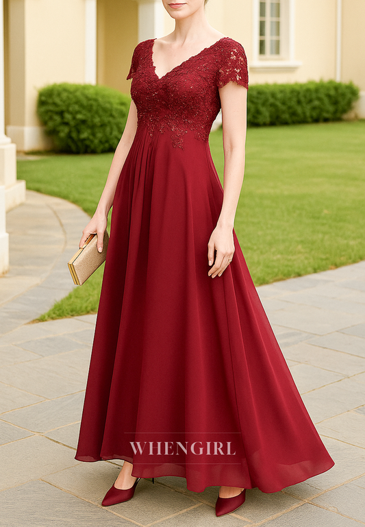 V Neck Rust Appliqued Lace A-Line Chiffon Ankle Length Mother of the Bride Dress