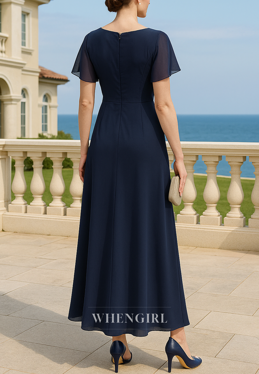 Navy Flutter Sleeves Sheath Asymmetrical Neck Ankle Length Mother of the Bride Dress