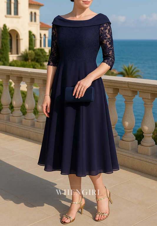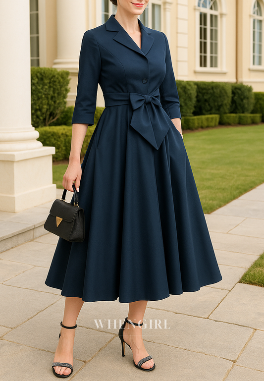 Navy V Neck Tea Length 3/4 Sleeves A-Line Mother of the Bride Dress