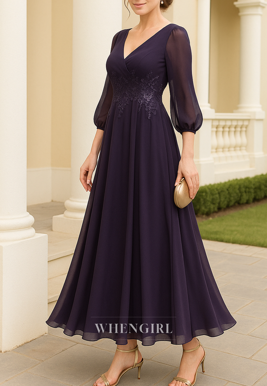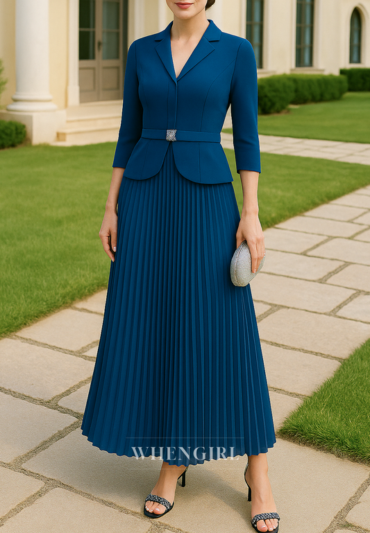 Navy Ankle Length V Neck 3/4 Sleeves A-Line Mother of the Bride Dress